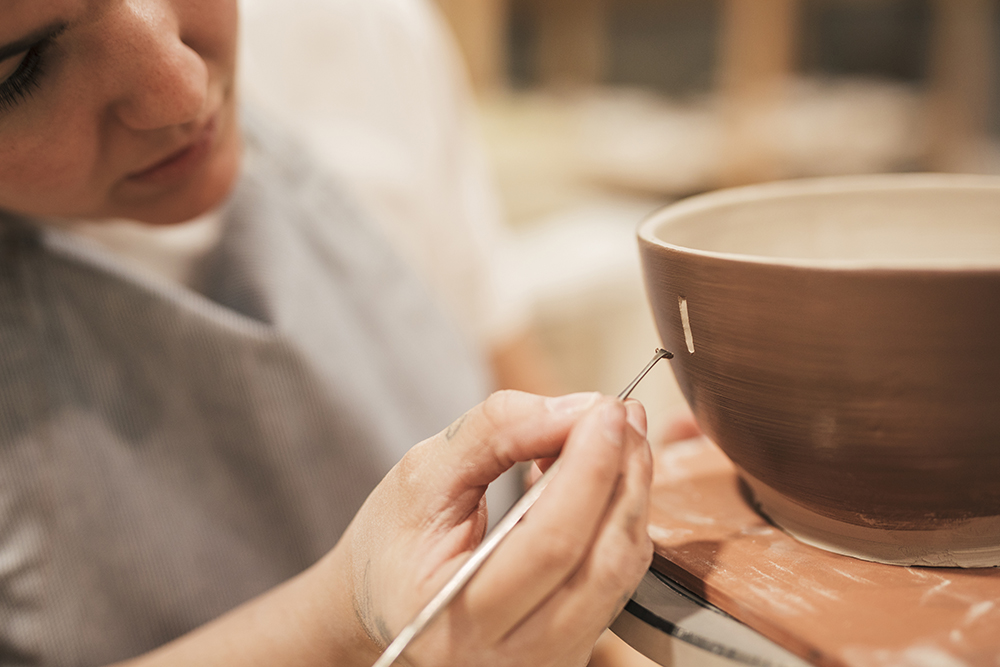 O desenvolvimento das peças em cerâmica será feito através das técnicas (pinch pot, acordelado, placa, técnica mista, ocagem, torno manual), contando com nossos equipamentos (plaqueira, extrusora, torno, moldes...) e várias ferramentas manuais.